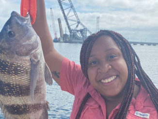 As her husband was pulling up the anchor with the boat in neutral, Cassini Williams reeled in this 22 inch, six pound sheepshead at the Trestles and the Twin Span Bridge on Nov. 11, 2020.