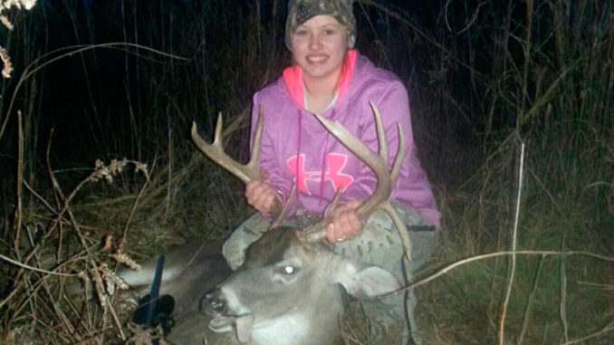 Madison Sheppard, 20, with her first buck taken from 120 yards out using a CVA 35 Whelan while hunting with her grandfather in Franklin Parish.