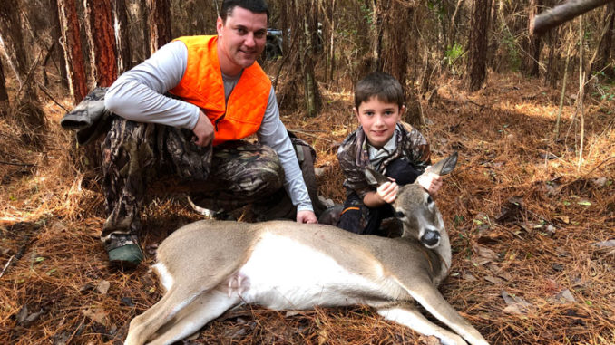 Ten-year-old Gavin Trosclair and his dad, Todd “TJ” Trosclair, with the 130-pound doe Gavin shot on Jan. 31 at their family’s lease north of Greensburg, La.