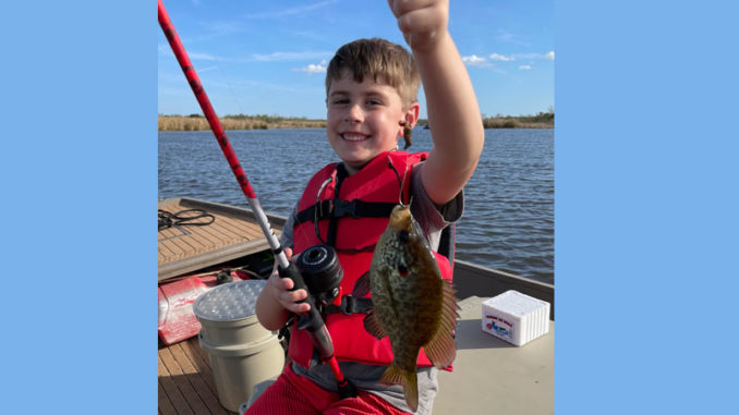 Landon Parks shows off a redear sunfish, his favorite fish to catch, at Lake Boeuf in Raceland.