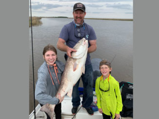 Kailey Kennedy hooked this huge red on March 28 near where the Pearl River meets Lake Borgne. She revived it and then turned it loose. Also pictured are her father, Russell Kennedy, and Ruston Kennedy.