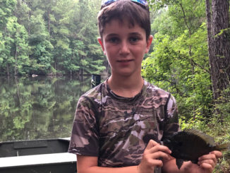 Eleven-year-old Gavin Trosclair with a nice bream he caught on July 3 while fishing in a pond on his family’s lease north of Greensburg.