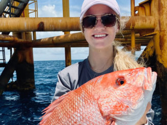 Abbie Bayham, of Team GTS, hooked her first red snapper of the year on a trip out of Cocodrie.