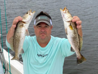 Chris Russo with a pair of specks caught under the birds at Toenail Reef. Chris Russo and Jeffrey Bell show off a great speckled trout catch from Lake Anastasia.