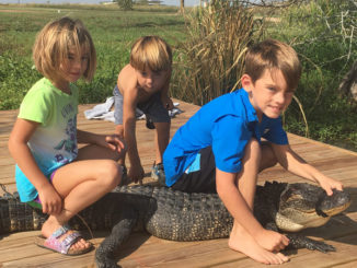 Charlie Morgan, 10, Marley Hearald, 8 and Hank Morgan, 4, helped catch this alligator on Lake Bruin.