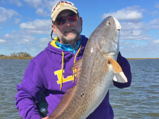 Sean McCoy was fishing out of Golden Meadow in Catfish Lake on Oct. 29 when he tied up with this 38-inch red using an H&H Double Rig on a Lew’s Xfinity Spinning combo. (Photo and