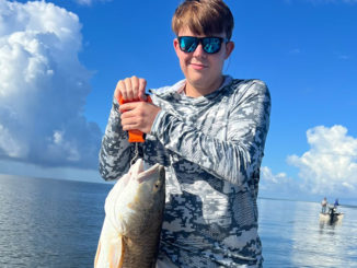 Jake Gauthier landed this bull red at Point-aux-Chenes on Aug. 27 on a Chartreuse double cocahoe rig with the expert guidance of his cousin Willie Beavers, Mitchell Hukins, and Capt. Shane Hukins of Cottonport.