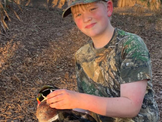 Saeran Beckham, 10, got his first duck on Feb. 3, 2024. His grandfather, “Pappee” Eddie Veade, took him hunting on Mill Bayou in Hamburg, La., for the youth hunt.