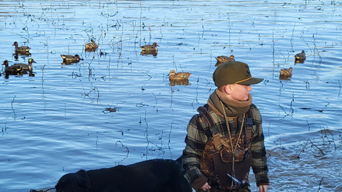 Grayson Edwards, 9, helping Ace gather up a few green-winged teal in LaSalle Parish on Dec. 26, 2023.
