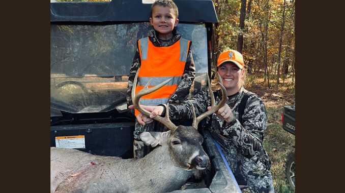 Brittany Ezell-LeJeune and her sidekick, her son Blayson LeJeune, with the Area 2 Hornbeck, La., buck she took on Nov. 19, 2023. The 8-point had a 16-inch inside spread.