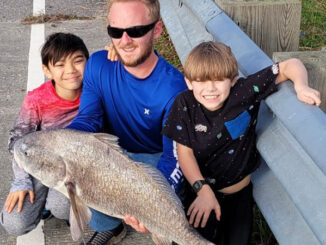On a cold Friday in December, Paul Mangum, his nephew, Jack Mangum, and friends caught a large black drum off the bank in Dulac. After a long day of bait stealers and no bites, they
