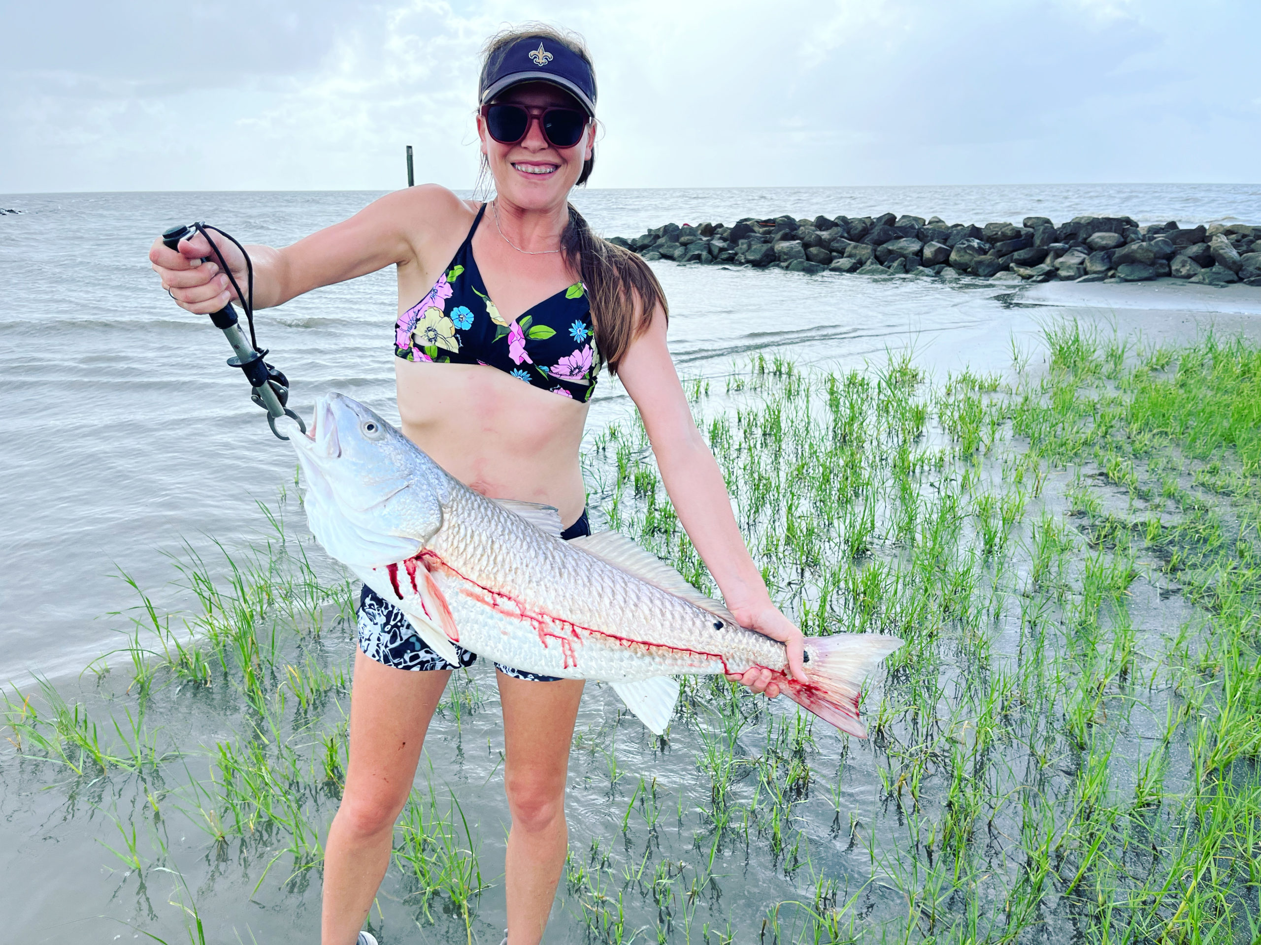 Jennifer Langlinais of Mouton Cove fought this bull red at Cheniere Au Tigre for over 20 minutes. It broke her reel off her pole but she was able to walk backwards towards the beach while hand turning it to get it in!