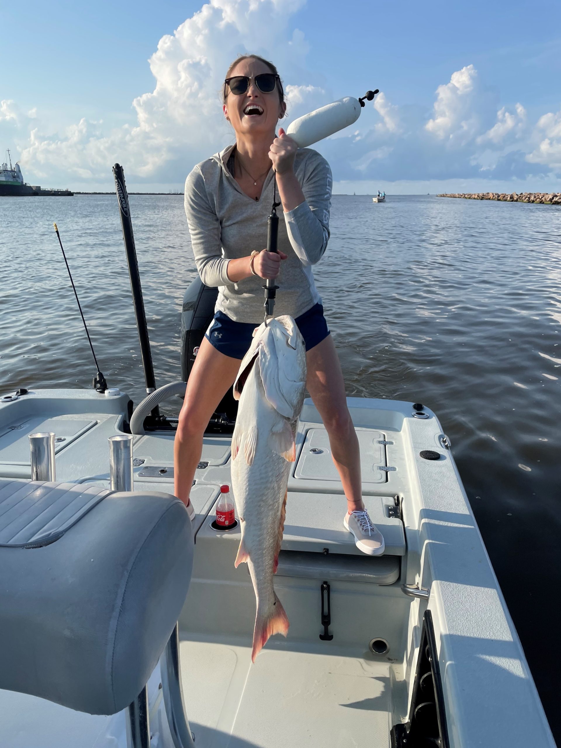 On July 31, 2021, Arden DeLany caught this bull red, which bottomed out the scale, at the Cameron jetties on live mullet with a medium action, speck spinning rod. She was fishing with family friend Brett Stansel. It was quite a fight, but the red was resuscitated and released.