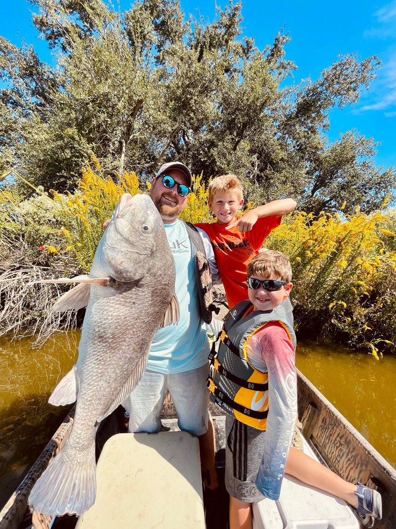 Tucker Giles, Luke Moore, and George Giles with a over 40-inch black drum. This big ugly and several others are the largest fish the boys have ever caught and were all released in Delacroix to fight another day.