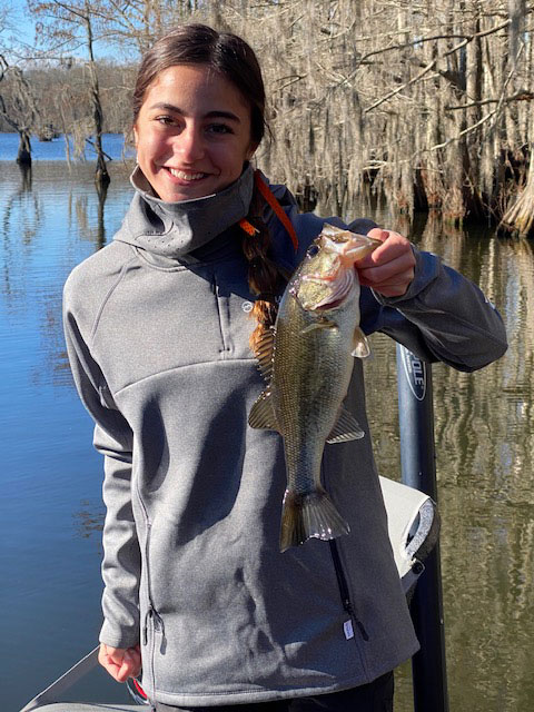 Cameron Willis, an 11th grader at Pine Prairie High School, is the only girl on her school’s new fishing team. She recently beat the boys! Her bass was only 1.9 but it was the biggest and it was caught at Chicot State Park.
