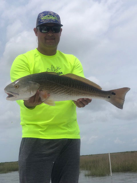 Travis Callais with a redfish he caught on a spoon while fishing in the marsh near Fourchon, LA, in June 2020.