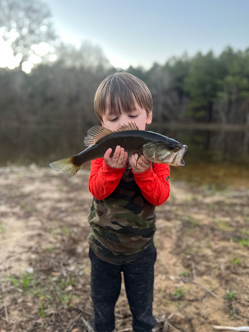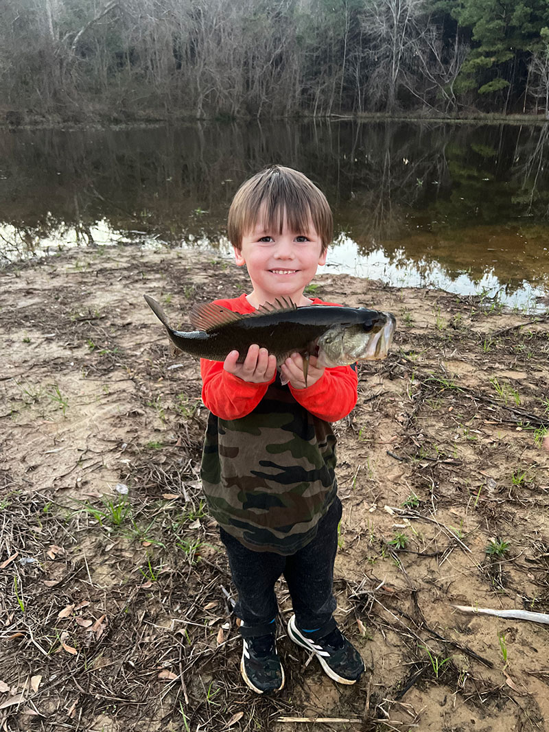 Frank Levert, 3, caught his first fish all by himself and was so proud! He is now hooked and obsessed with fishing, so much so that all he wants to do is fish every day and sing and listen to Luke Bryan’s songs “Huntin’, Fishin’ Lovin’ Every Day” and “Bill Dance”! He caught this bass at their pond in St Francisville on a Strike King chartreuse pond spinnerbait on Jan. 22, a day both he and his father, Clint Levert, will never forget.