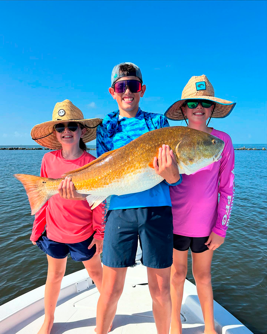 Graham Howard caught this 42-inch bull red out of Hopedale while with his sisters Lyn and Hannah on a family fishing trip. He used live shrimp on a drop shot.