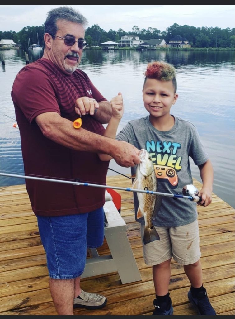 On June 18, 2021, Ethan Meyer-Vollenweider caught his first redfish while on vacation with his Paw Paw at Wolf Lake in Foley, Alabama. The smile on his face says it all.