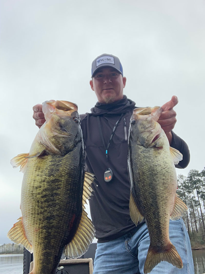 Heath Kennedy with a 10.3-pound bass and a 6-pound bass caught directly on the tail end of a bad storm on March 23, 2022 at Caney Lake in Chatham.