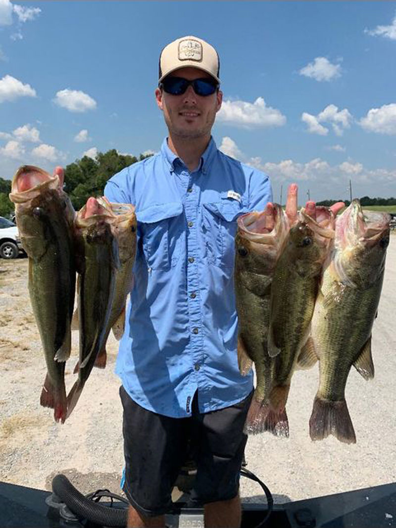 Morgan Booksh caught these bass, all weighing in at three pounds or more, with spinner baits and by punching lily pads while fishing near Henderson, L.A.