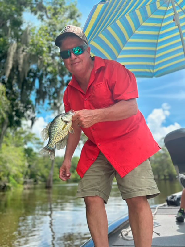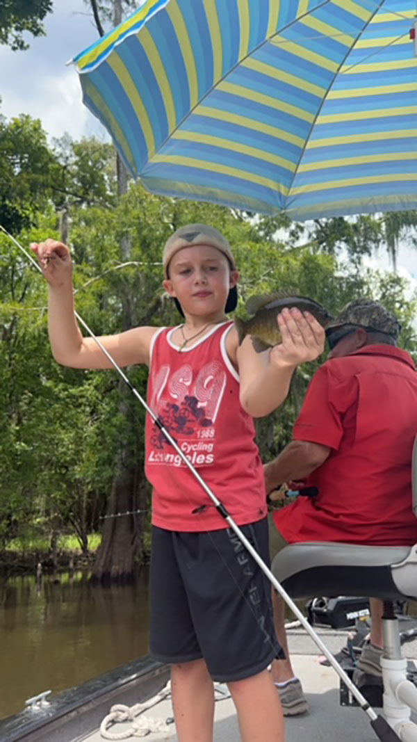 James Seneca (below) and his grandson, Jake Michael Neuville, both of Loreauville were fishing for sac-a-lait using worms in Beau Bayou in the Basin on Aug. 24, 2024.
