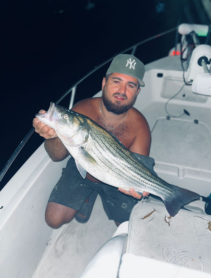 “This is well over my 100th striper of the year with my biggest so far following a 4.8 personal best striper I caught two months ago. They all range from 10-20 inches on average. I started targeting these fish at night in the beginning of the year and we finally got a decent striper. We go out almost every night as I live 6 minutes away and we average five to 10 stripers depending on current and water clarity. We’ve been catching a lot of nice hybrids, redfish, speckled trout, striped bass and flounder, all within 1 mile of the boat launch. All fish are caught on artificial lures.”