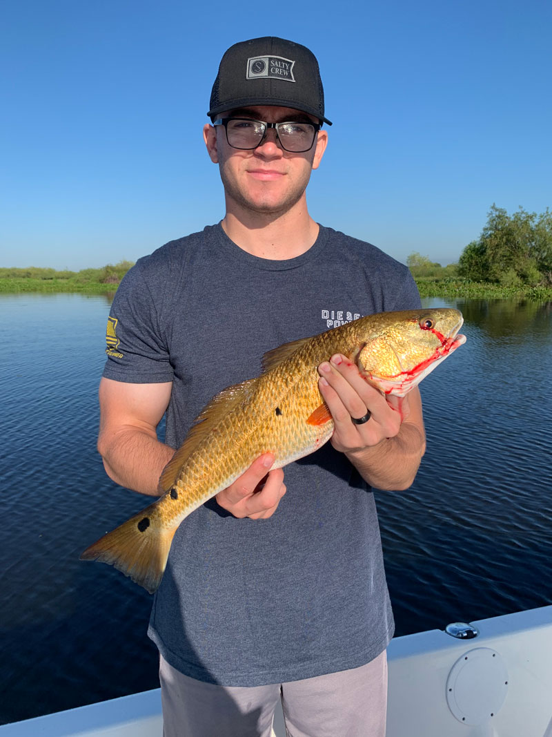Cpl. (USMC) Keith Bender caught his first redfish in Chauvin fishing with his dad Tim.