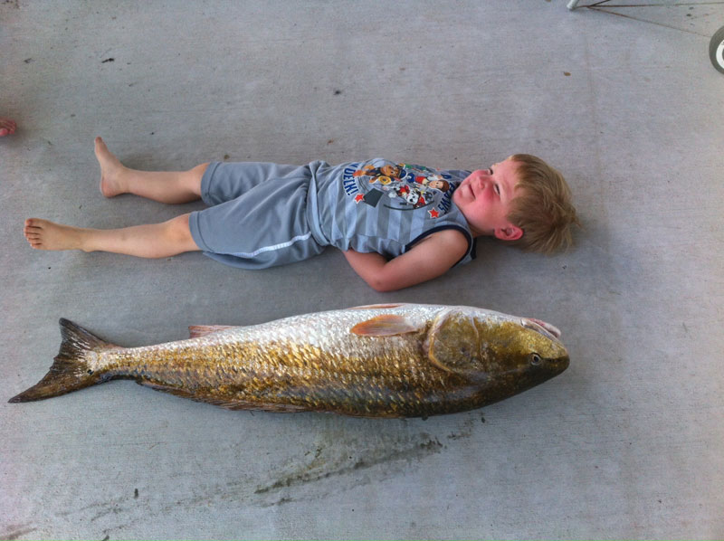 Roxanne Lousteau’s grandson Jake Fowler sizing up a bull red she caught in Grand Isle.