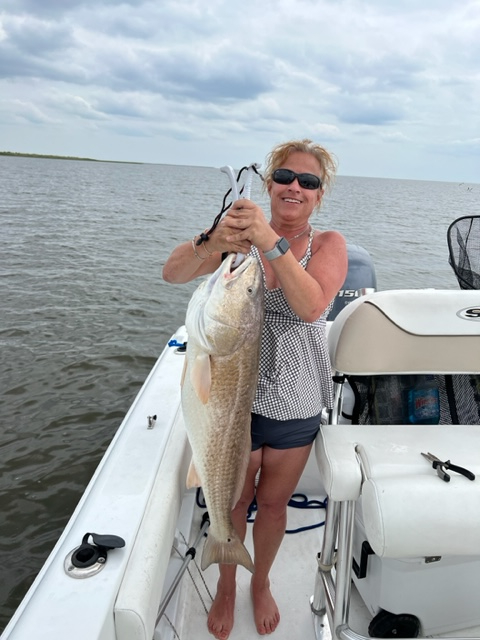 Lauren Crisostomo caught this 37-inch bull red on Big Lake with live shrimp.