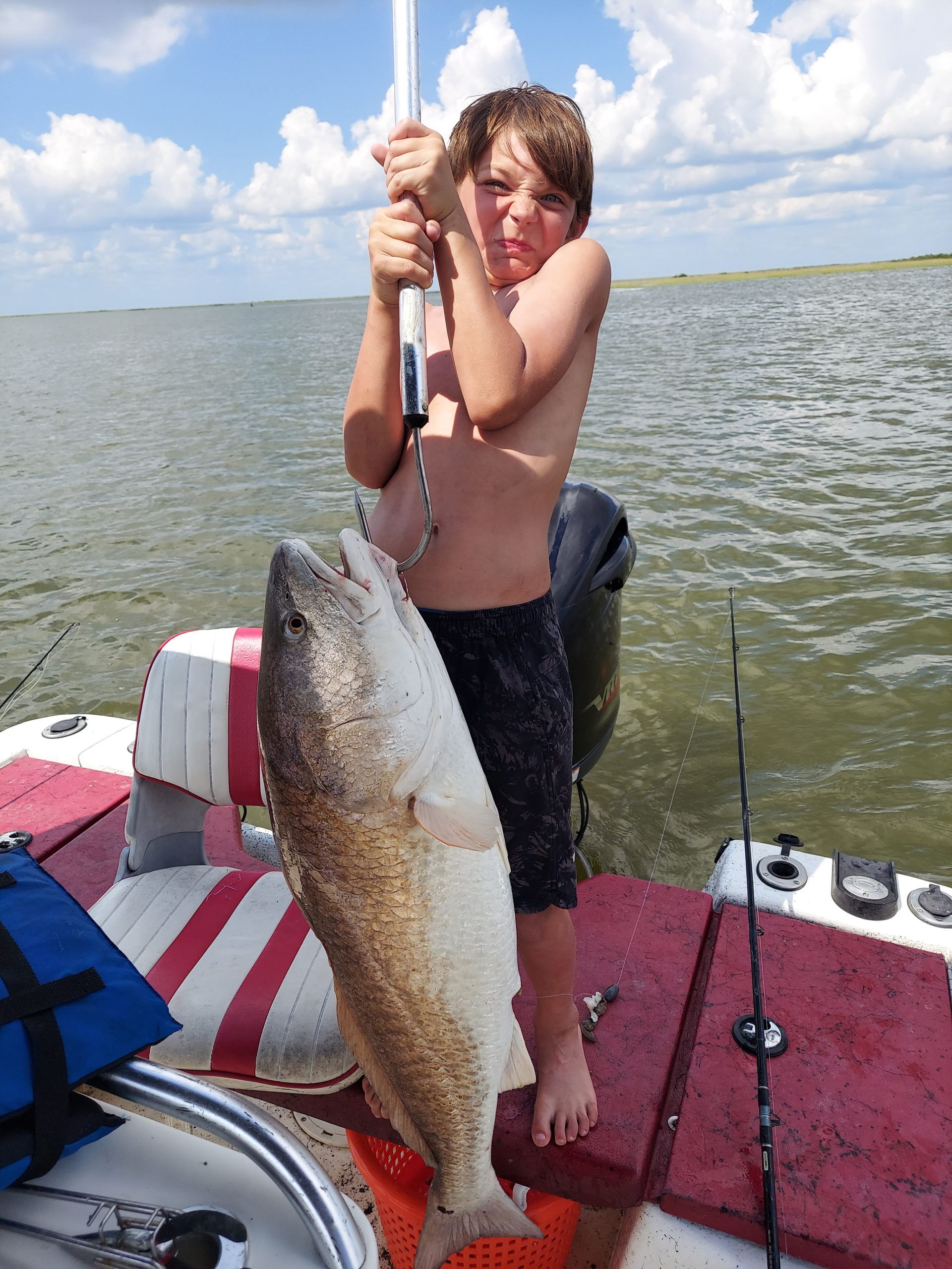 Stratton Ray landed his monster red over the Fourth of July weekend while fishing Bayou Dularge with cracked-crab on the bottom. They landed the fish, took a picture, and released the fish to swim another day.