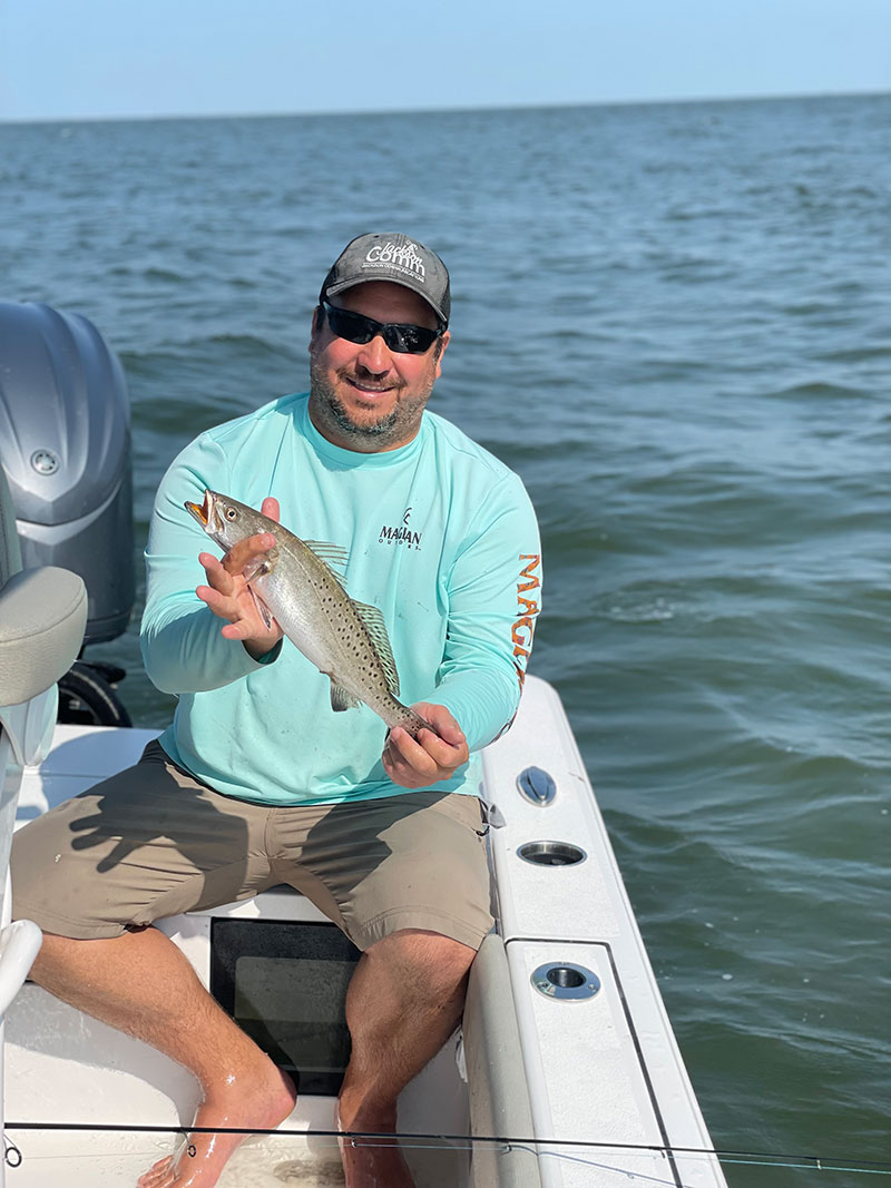 Michael Kuhn catching specks using live shrimp on his birthday, May 27, 2023, off the rigs of Cocodrie.