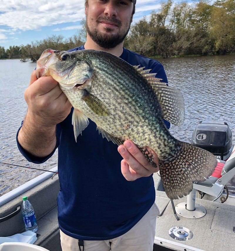 Caught in 18 feet of water jigging a minnow off a two foot break in the Atchafalya Basin, Lake Bigeaux. Measured 14.75 inches. My biggest to date since moving to Louisiana.