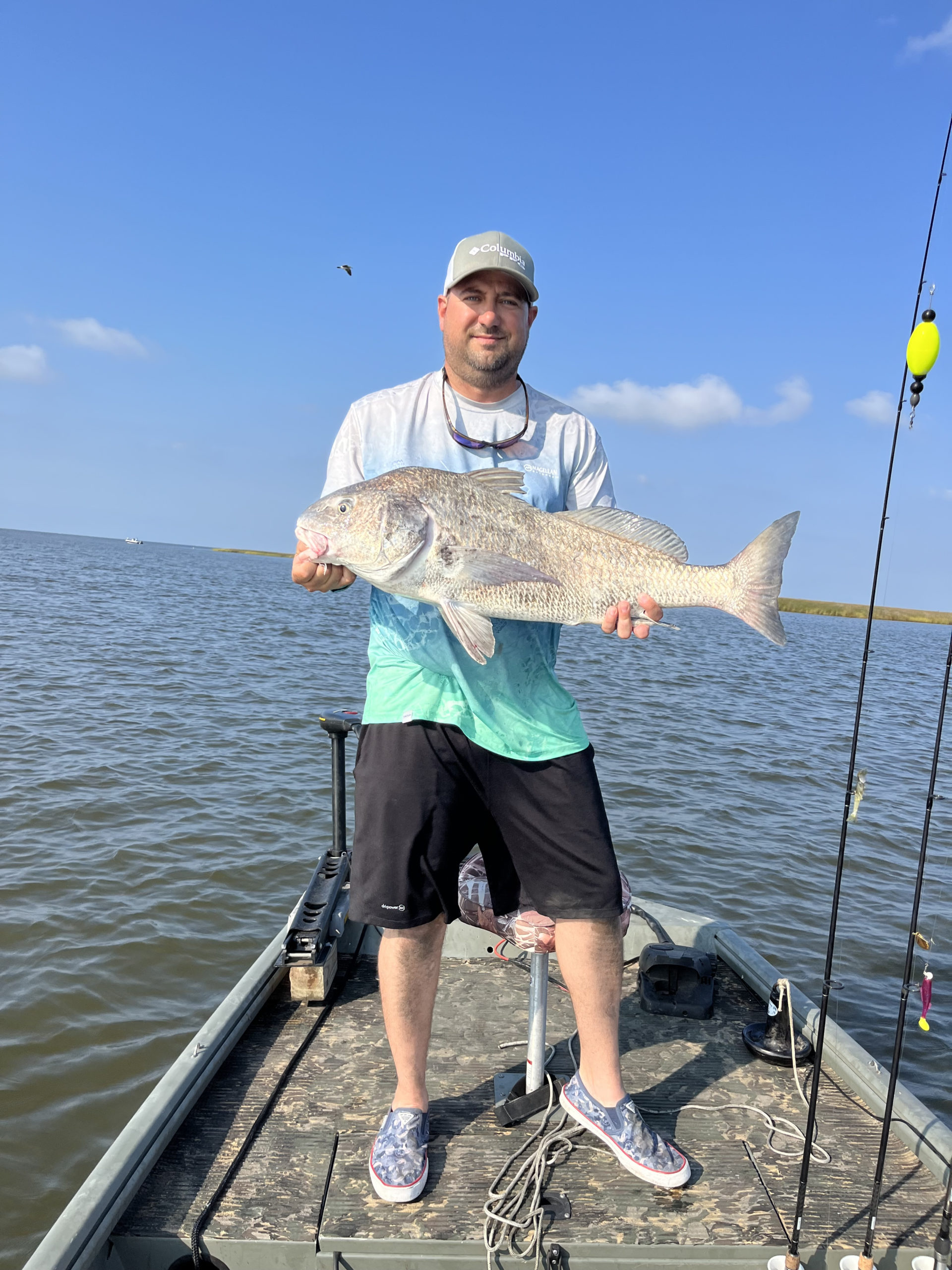 Derek Stelly caught this 36-inch black drum in Wilkinson Canal near the mouth of Barataria Bay on Aug. 26. The fish fell for a VooDoo shrimp under a Four Horsemen popping cork.