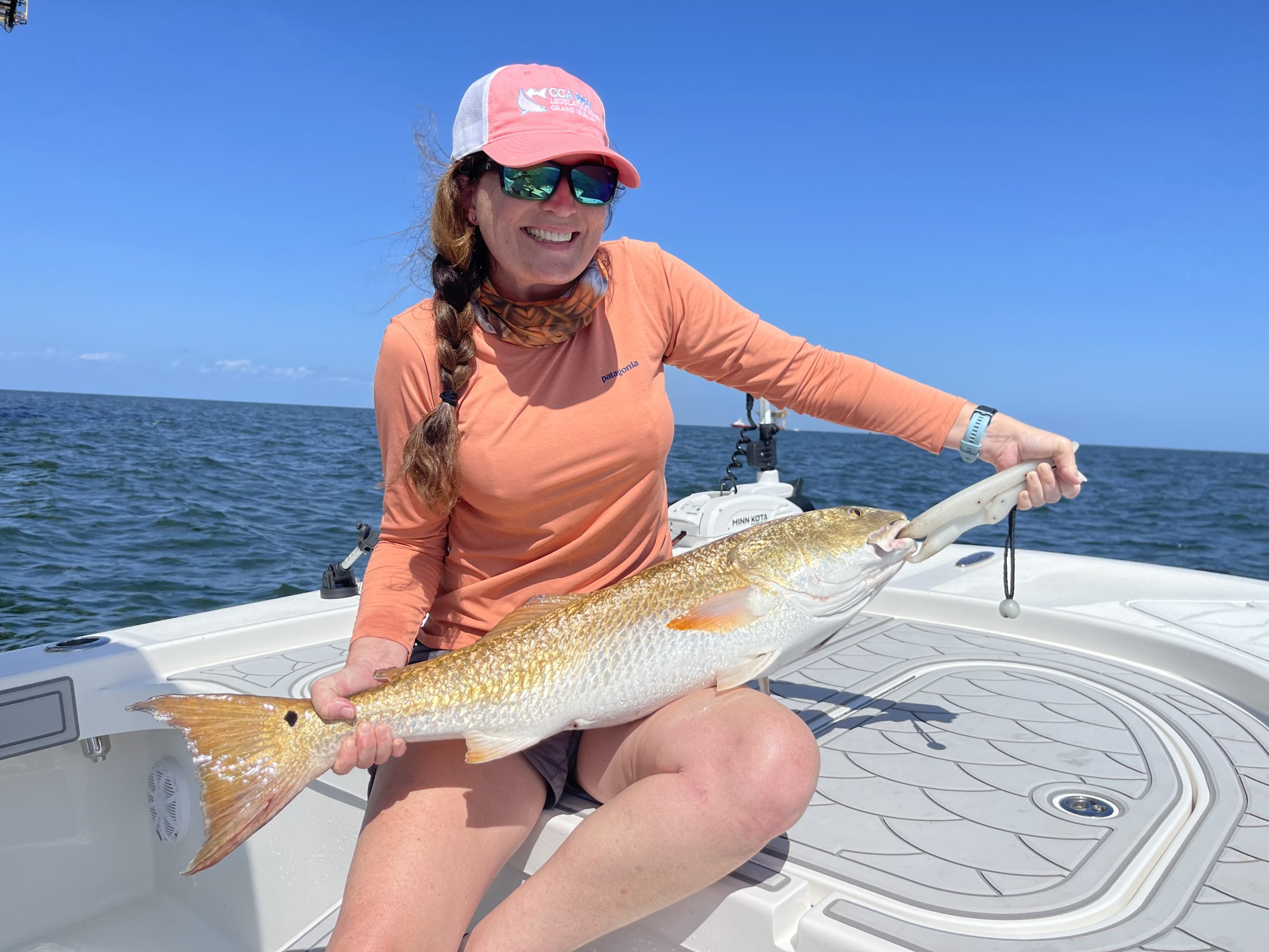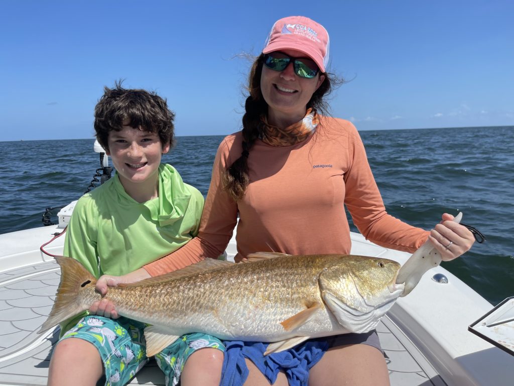 Nicole Morello and her son Jake with one of the beautiful bull reds she caught around rigs in the Ship Shoal area south of Terrebonne Parish in June.