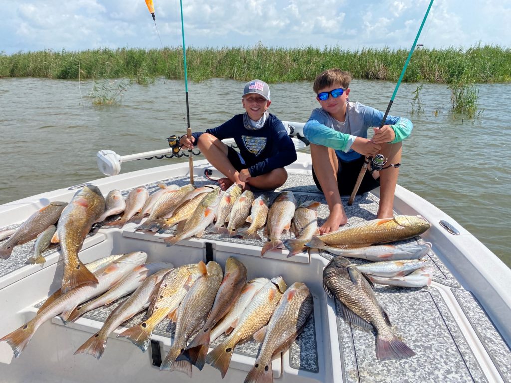 Ethan Emonet, 11, and Joseph Bourgeois, 11, both 6th graders at St. George Catholic School in Baton Rouge, wanted to get on the water before studies and sports take over. They fished in the Venice/Pass A Loutre area on Saturday with little success, then on Sunday, Aug. 8, near South Pass just east of the Port Eads Lighthouse they hit the redfish and had a blast with their dads, Mark Emonet and Ray Bourgeois.