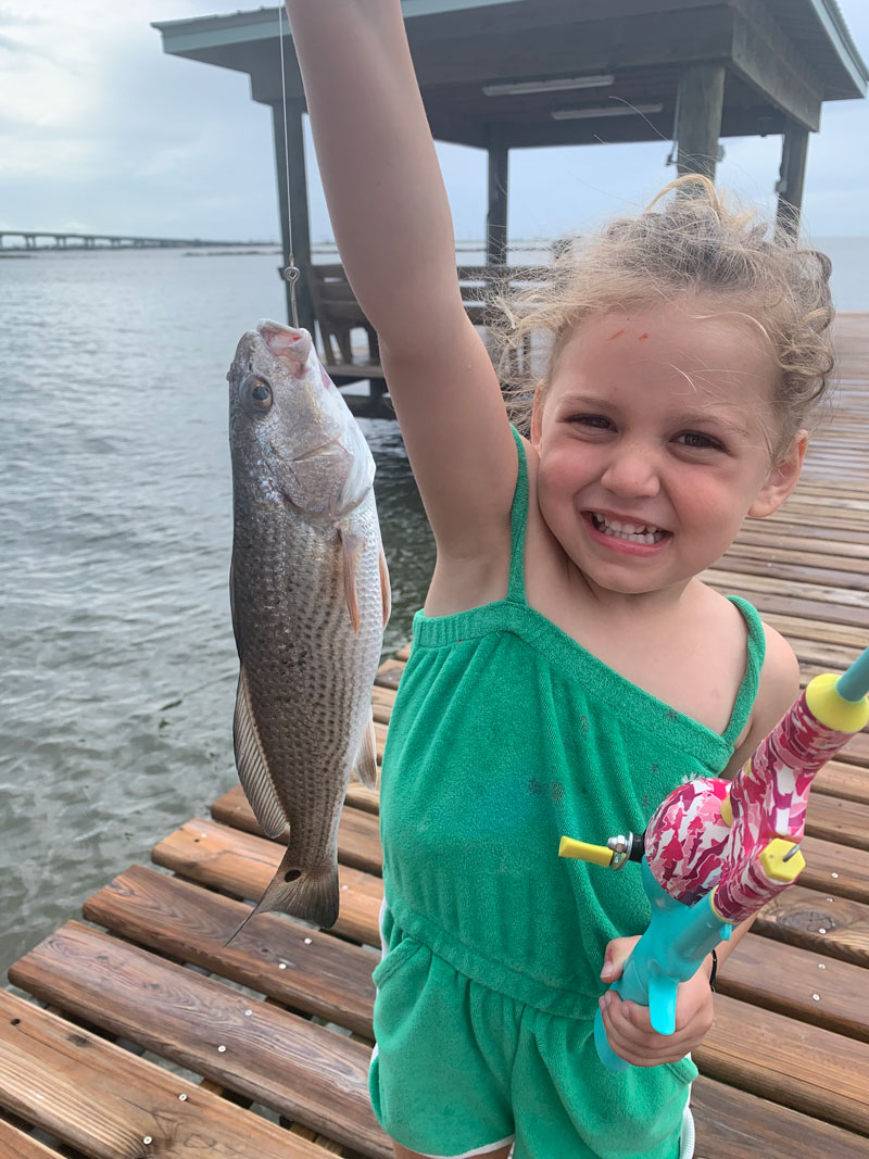 Rylee Frank, 4, caught her first fish (casting and reeling herself) off a pier in Grand Isle.