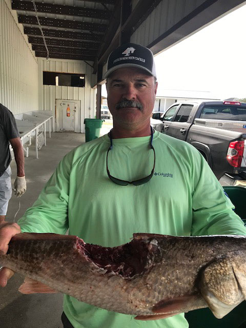 While fishing out of Golden Meadow with his friends Troy Robichaux, Steven Bower, and Mike Doyle on Oct. 19, Todd Grant was attempting to land this redfish when what was most likely a bull shark took a bite out of it.