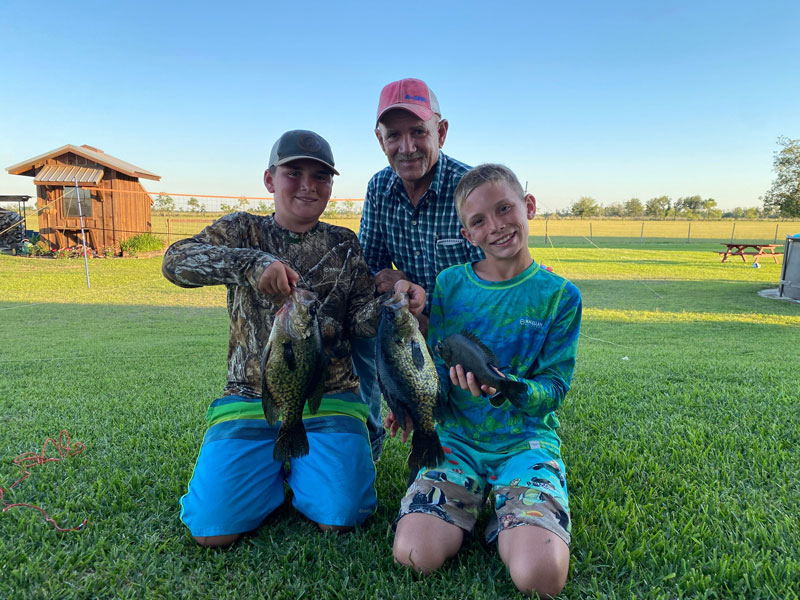 From left to right, Ty Gaudet, Tony Dommert and Lane Gaudet show off a pair of 2-pound slab crappie and 1-pound brim caught in a pond in Sulphur.