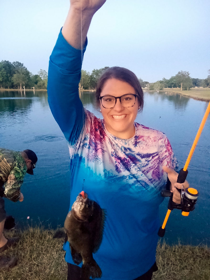 “It was April 30. We were fishing near Charenton when my little sister’s bobber vanished, leaving a splash that only told us whatever took the hook was hangry (hungry/angry). She set the hook in shock and was in for a fight! It took nearly 90 seconds to land this beast. The light tackle and rapidly exhausting muscles managed to bring the small whale to surface twice during this battle of wills. With a sweat beaded brow, she managed to swing this prehistoric creature up the side of the bank and onto the grass where a small audience had gathered. All were in awe and speechless for the first few seconds as we were all in dismay. Then, like a gunshot awakens the woods on a calm morning, my sister shrieked with excitement. This fish could have been a world record. We should have been contacting the local news outlets for live coverage of this monstrosity. But there was a spiritual connection between the two. She held the defeated fish up for a picture, then released it so that it may continue its magnificent journey. Since this day, we still talk about the one that didn’t get away. The one that didn’t win. The one that will live on in story for generations ahead. The fish she named Goliath.”