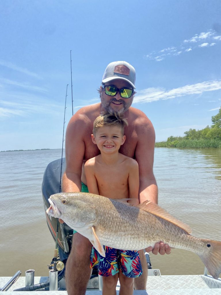 Thomas Blanchard, 7, with his grandfather, Chad Miller, both of Morgan City, holding Thomas’s first bull red, which was caught June 4, 2023 while fishing at the mouth of the Atchafalaya River.