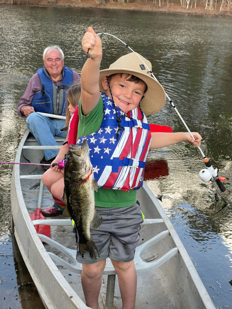 Fisherman Tucker Goings, 5, with his awesome catch from his Paw Paw’s pond in Mt. Hermon, La., on March 5, 2022. In the canoe with him is his Pawpaw, Randall Garcia, and his sister, Brynlee Goings. Tucker loves to fish and often practices casting in his back yard. Last summer he caught his first tabby on rod and reel and is now so excited about his first bass all by himself! He could be heard for miles hollering, “Whoooo, whoooo! I got him!”, as his family stood on the banks cheering him on while he reeled his fish in.