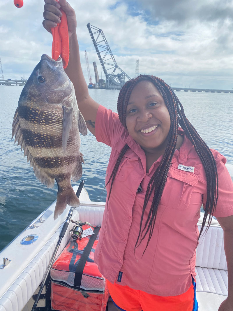 As her husband was pulling up the anchor with the boat in neutral, Cassini Williams reeled in this 22 inch, six pound sheepshead at the Trestles and the Twin Span Bridge on Nov. 11, 2020.