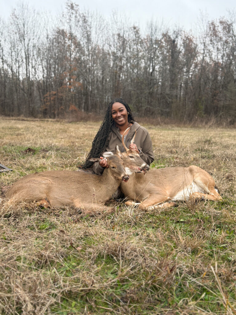 “My husband (kwsoutdooradventures) and I climbed into the stand on a private pipeline in North Louisiana at 6 a.m., with shooting light starting at 6:39. Right at shooting light, deer began moving. At about 6:45, I took my first shot on a spike that stepped out down one shooting lane.
