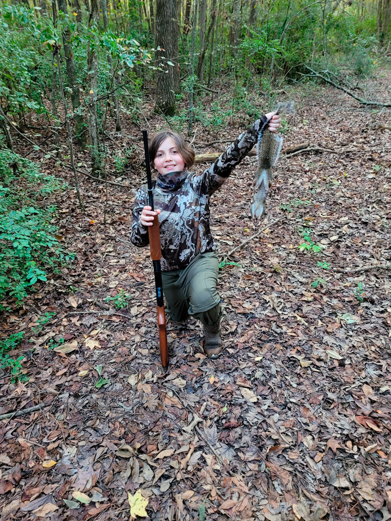 Eight-year-old Ana Bergeron had been asking her father Willie to take her hunting for over a year. On the opening morning of squirrel season Ana finally bagged her very first squirrel, which was promptly fried up and eaten for lunch. We now have a sportswoman for life!