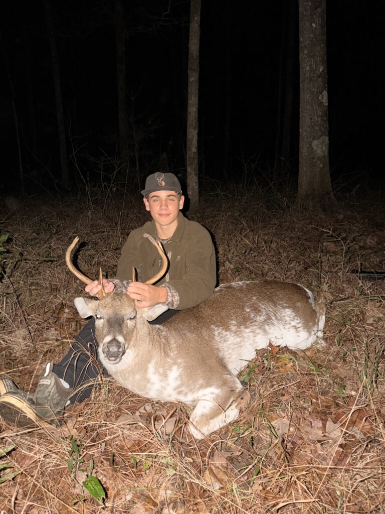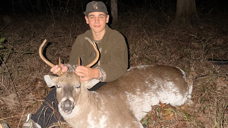 John Wallace “JW” Jones, 15, of St. Francisville harvested a piebald 6-point buck in West Feliciana Parish on Dec. 23. The evening before the hunt, his father, Bennett Jones, captured a picture of the deer at 5:10 p.m., marking the first time the buck appeared on their lease. Unbeknownst to them, a friend had the same piebald buck on camera for the past three years approximately one mile away in neighboring East Feliciana Parish.