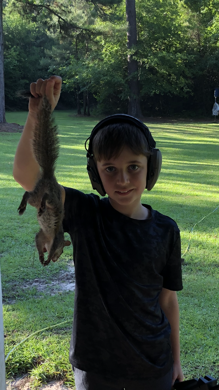 Gavin Trosclair, 10, with the first of three squirrels he killed May 2, 2020 at their family lease north of Greensburg, La. All three were head shots using his Paw J’s .17HMR rifle.
