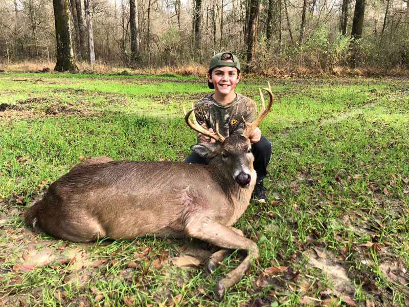Stewart Haddox of Baton Rouge was patient all season and it paid off. He shot his first deer in January, 2022. It was a big Tensas Parish 8-point. And he got an extra surprise in addition to taking a trophy as his first deer. He and his father, Adam Haddox, got to the stand early because deer were moving. They hadn’t been there 30 minutes when the big buck walked out in the food plot about 75 yards away. Stewart dropped the deer where it stood with his 7mm-08 rifle. While they were waiting about 20 minutes to make sure it was down for good, things got a bit intense. A big black bear weighing around 250 pounds also saw the deer and walked straight out of a thicket to the downed deer. It took a lot of loud noise and his dad getting down from the stand to finally scare the bear away and let the young hunter claim his trophy.