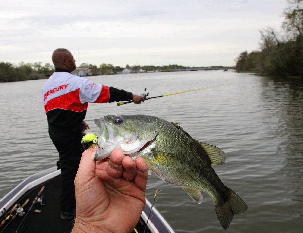 Running a couple miles east, near Patterson City Hall, we started trolling the woods farther off the bank than I expected. In spite of the fact that we were making some pretty long casts, it wasn’t long before I set the hook on a small bass that didn’t quite make the 14-inch minimum required by law to put in the live well. So, like a pro, I released the fish.