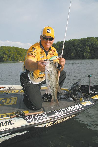 In deeper spots, maybe 10-13 feet, Davis will use a Strike King Series 5 crankbait and switch to a Strike King Redeye Shad for shallow hunting. He likes the red, brown and orange tones of crawfish patterns, but in stained water, he goes with a chartreuse bait with a brown back.